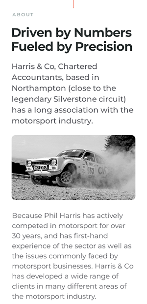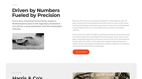 Harris & Co specialise in motorsport accountancy, offering expert financial and tax support customised to the unique demands of the industry. They partnered with Advansys to create a focused, professional website that clearly communicates their niche offering and industry authority.