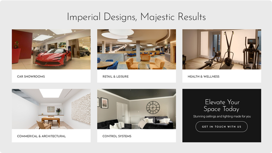 Imperial Integrated Systems are a family run business specialising in bespoke illuminated stretch fabric ceilings, LED lighting, and wireless control systems. They asked Advansys to create a concise one page website that clearly explains who they are, what they do, and how their lighting solutions can be applied across different spaces. We designed an elegant, luxury looking page that introduces their services, outlines the process, and highlights the versatility of their products. A dedicated gallery section provides striking visuals to inspire visitors, while a clear contact area makes it easy for potential clients to get in touch.